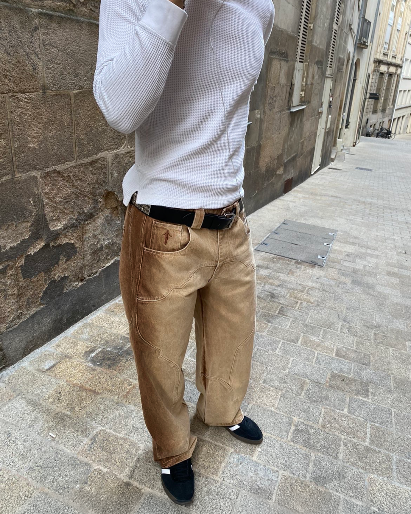 - Le modèle du pantalon beige porte un taille L et mesure 1m85 et 70kg.
